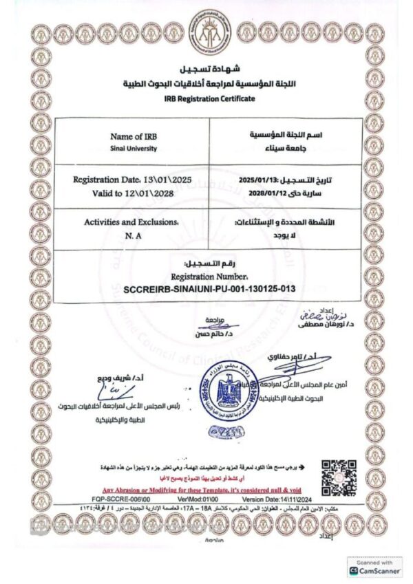 Registration of Sinai University’s Institutional Committee for the Review of Scientific Research Ethics at the Supreme Council for the Review of Clinical Medical Ethics under the Cabinet of Ministers